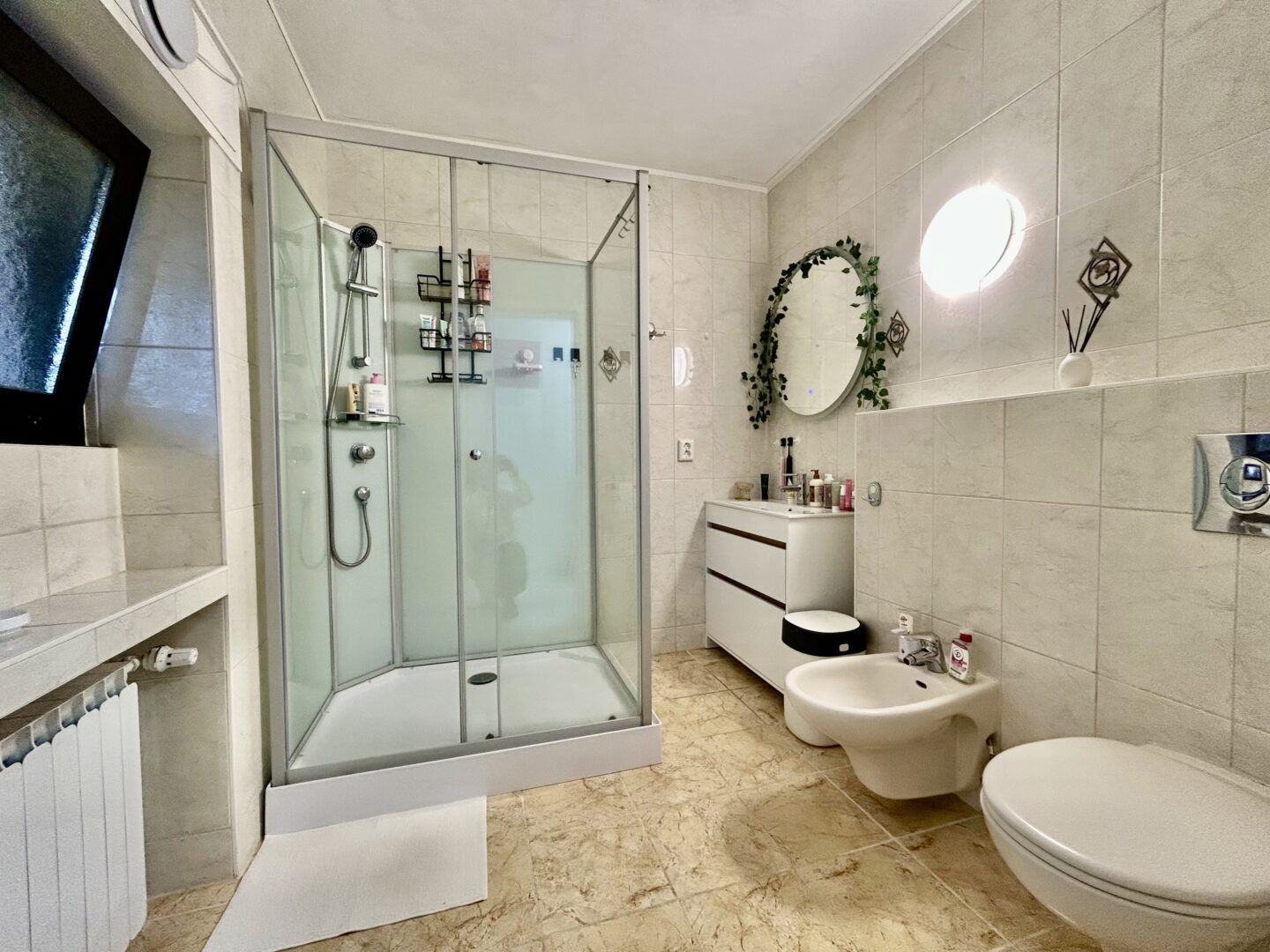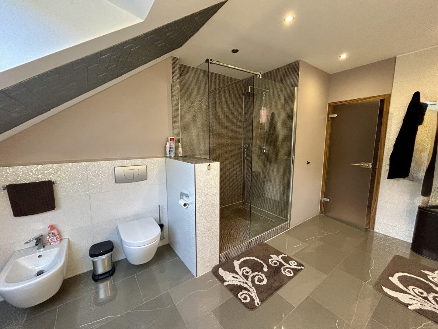 - Bad mit Wanne, großer Walk-In Dusche, Doppelwaschbecken, WC und Bidet